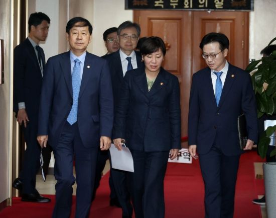 구윤철 경제부총리 겸 기획재정부장관(왼쪽)을 비롯해 김정관 산업통상자원부 장관(오른쪽), 조현 외교부 장관(왼쪽 두번째), 송미령 농림축산식품부 장관(오른쪽 두번째), 여완구 통상교섭본부장(맨뒷쪽)이 22일 서울 종로 정부서울청사에서 열린 대미관세협상 관련 대외경제장관회의에 참석하고 있다.