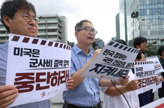 시민사회단체연대가 22일 서울 종로 광화문광장 미국대사관 건너편에서미국의 부당한 관세 인상 및 군사비 증액 압박 중단을 촉구하는 규탄 기자회견을 하고 있다.