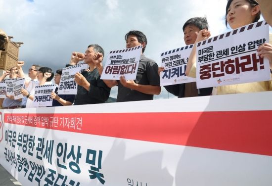 시민사회단체연대가 22일 서울 종로 광화문광장 미국대사관 건너편에서미국의 부당한 관세 인상 및 군사비 증액 압박 중단을 촉구하는 규탄 기자회견을 하고 있다.