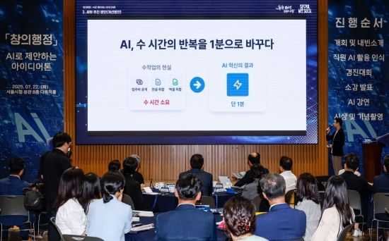 22일 서울 중구 서울시청에서 열린 'AI로 제안하는 창의 아이디어톤'에서 직원이 AI를 활용한 창의행정 발표를 하고 있다.