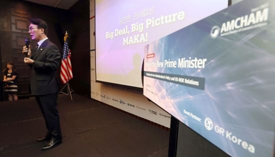 김민석 국무총리가 22일 서울 여의도 콘래드서울 호텔에서 열린 주한미국상공회의소(AMCHAM KOREA) 세미나에서 기조연설을 하고 있다. 청사사진기자단