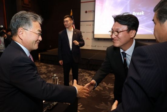 김민석 국무총리(오른쪽)와 조셉 윤 주한 미국대사 대리가 22일 서울 여의도 콘래드서울 호텔에서 열린 주한미국상공회의소(AMCHAM KOREA) 세미나에서 인사를 나누고 있다. 청사사진기자단