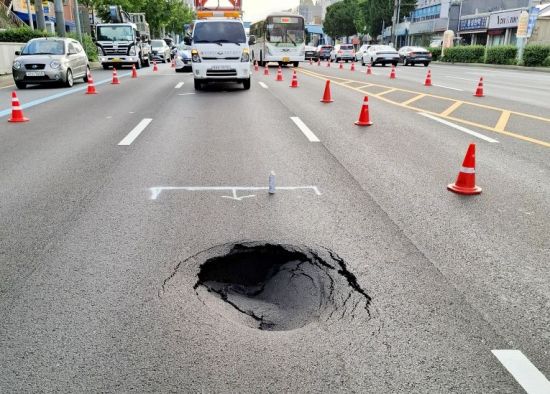 서구는 깊이 40㎝, 직경 80㎝에 달하는 싱크홀 발생 직후 해당 구간의 2개 차로를 통제한 뒤, 복구 작업을 실시 중이다.
