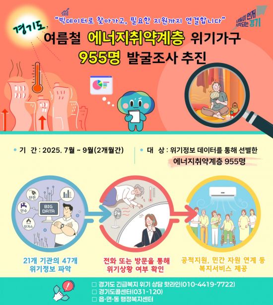 한경수 경기도 복지사업과장은 "무더위로 인해 온열질환이나 냉방비 부담 증가로 취약계층의 어려움이 늘어나는 시기인 점을 고려해 위기정보 빅데이터를 활용해 에너지취약계층을 포함한 복지 사각지대를 선제적으로 찾아서 지원하고자 노력하고 있다"고 말했다.