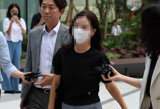 김건희 여사 일가의 집사로 알려진 김예성 씨 부인 정 모씨가 23일 서울 종로구 KT광화문빌딩 웨스트에 마련된 김건희 특검 사무실로 출석하고 있다.