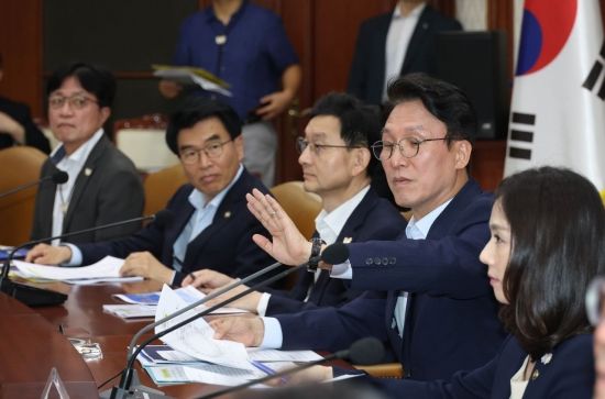 김민석 국무총리가 23일 서울 종로구 정부서울청사에서 기업인, 인프라 및 콘텐츠 분야별 전문가 등이 참석한 가운데 열린 APEC 점검 종합보고에서 시계를 보고 있다.