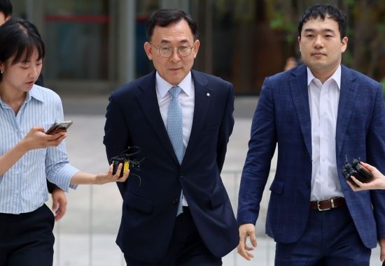 정근수 전 신한은행 부행장이 23일 서울 종로구 KT광화문빌딩 웨스트에 마련된 김건희 특검 사무실로 출석하고 있다.