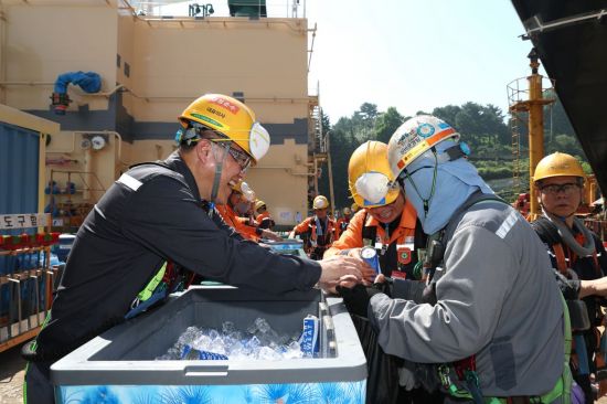 이날 김 대표는 제조총괄 이길섭 부사장 등 주요 임원들과 함께 1도크 인근 휴게실을 도보로 점검했다. 그는 체온을 낮추는 쿨토시·쿨마스크를 총 2만5000개 준비해 현장 근로자들에게 직접 전달했고, 시원한 음료도 손수 건넸다.