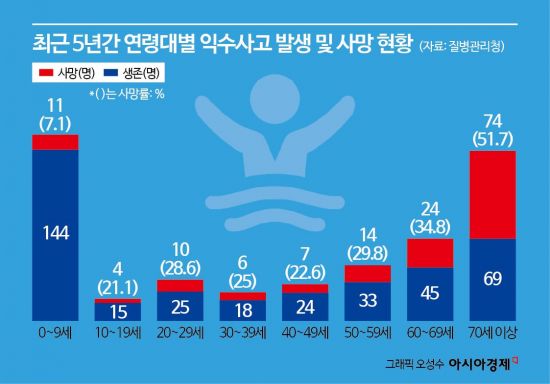 특히 익수사고로 실려온 70세 이상 고령층 환자 143명 중에서는 51.7%(74명)가 사망해 인구 고령화에 따라 70세 이상의 익수사고도 증가하고 있는 것으로 나타났다.