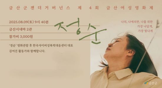 여성의 삶과 목소리를 진정성 있게 담아낸 정지혜 감독의 영화 '정순'이 충남 금산군 금산시네마 2관에서 오는 8월 9일 오전 9시 20분부터 상영한다.