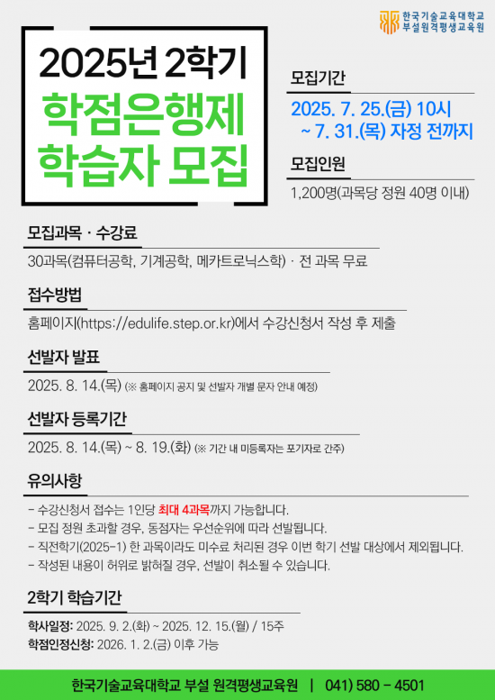 한국기술교육대학교 부설 원격평생교육원(원장 이문수)은 오는 9월 2일 2학기 개강을 앞두고 학점은행제 학습자를 모집한다고 24일 밝혔다.