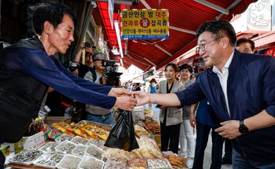 윤호중 행정안전부 장관이 24일 서울 금천구 비단길현대시장 시흥건어물을 찾아 민생회복 소비쿠폰 사용 현장을 점검하며 물건을 구매하고 있다.