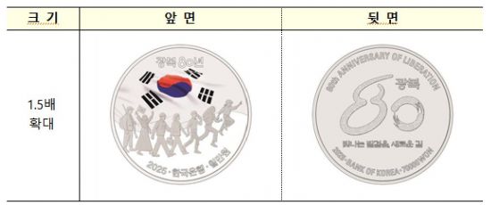 주화 명칭은 '광복 80년'이며, 액면금액 7만원짜리 은화 2종이다. 한은은 "주화 앞면은 과거와 현재 세대 간의 연결과 통합, 그리고 광복을 통한 미래에 대한 희망을 상징적으로 담았다"고 설명했다. 뒷면은 광복 80년 기념사업의 공식 엠블럼이다. 은화 1종은 태극기를 배경으로 독립운동가와 미래세대가 함께 행진하는 모습을, 2종은 빛줄기와 발자국, 물결무늬를 활용한 이미지를 담았다.