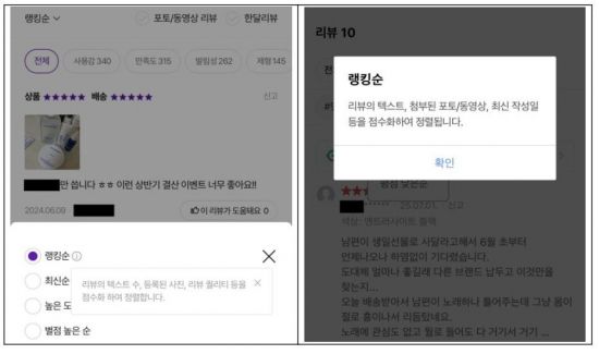 조사 결과 온라인몰 50개 중 33개는 리뷰를 인기순·랭킹순·베스트순 등 자체 알고리즘으로 기본 정렬해 표시했다. 이 중 18개는 알고리즘 기준이 공개되지 않았다.