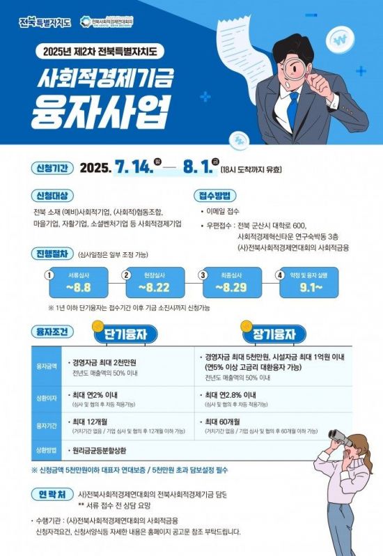 도는 이번 사업을 통해 사회적경제기업의 금융 접근성을 높이고, 자금난 해소와 더불어 취약계층 일자리 창출, 지역경제 회복 등 사회적 가치를 실현할 수 있는 기반을 마련한다는 계획이다. 자세한 사항은 ㈔전북사회적경제연대회의 전북사회적경제기금 담당자 또는 홈페이지에 게시된 공고를 통해 확인할 수 있다.