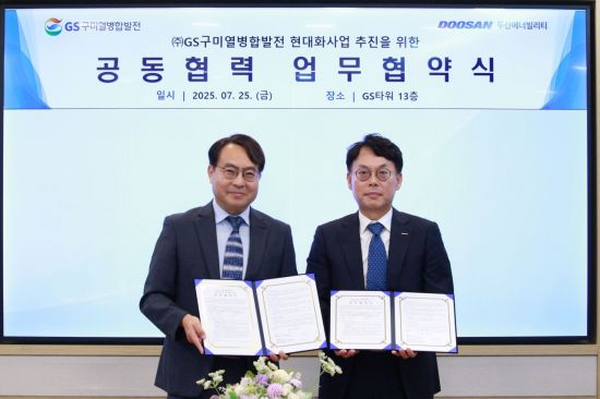 GS구미열병합은 25일 서울 강남구 GS타워에서 두산에너빌리티와 'GS구미열병합 발전소 현대화사업' 추진을 위한 업무협약(MOU)을 체결했다고 밝혔다. 이번 협약을 통해 기존 노후 석탄 설비는 액화천연가스(LNG)와 수소 연료 기반의 고효율 설비로 전면 교체된다. 협약식에는 이정균 GS구미열병합발전 대표와 윤요한 두산에너빌리티 파워서비스영업총괄 등이 참석했다.
