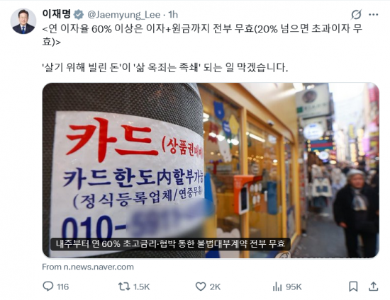 이 대통령은 "연 이자율 60% 이상은 이자+원금까지 전부 무효(20% 넘으면 초과이자 무효)"라는 내용으로 지난 22일 시행된 '대부업 등의 등록 및 금융이용자 보호에 관한 법률' 시행령 개정안 내용을 적었다. 이와 함께 "'살기 위해 빌린 돈'이 '삶 옥죄는 족쇄'가 되는 일(을) 막겠습니다"라고 강조했다.