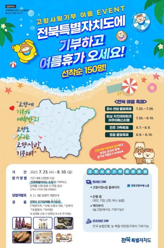 전북특별자치도가 고향사랑기부제를 널리 알리고 관광객의 참여를 유도하기 위해 내달 10일까지 '고향사랑기부 여름 이벤트'를 진행한다.