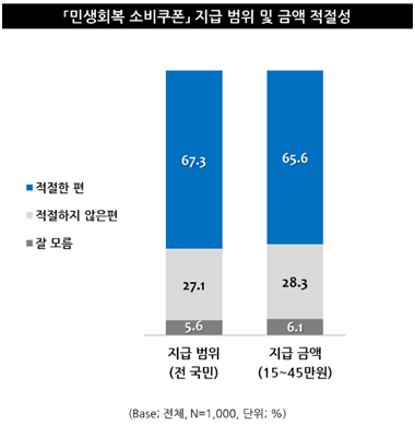 반면 정책 시행 방식에 대해서는 대체로 긍정적인 평가가 우세했다. '출생연도 끝자리를 기준으로 한 요일제 지급 방식'에 대해서는 82.0%가 긍정적으로 평가했으며, 지급 범위(67.3%)와 지급 금액(65.6%)이 '적절하다'는 인식도 지배적이었다.