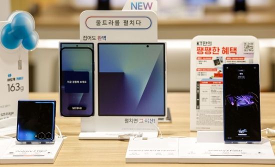 15일 서울 종로구 KT플라자 광화문중앙점을 찾은 고객들이 삼성전자 '갤럭시 Z 폴드7'과 '갤럭시 Z 플립7'이 전시돼 있다. KT는 15일부터 21일까지 전국 KT 매장과 KT닷컴에서 '갤럭시 Z 폴드7'과 '갤럭시 Z 플립7' 사전 예약을 진행한다고 밝혔다. 2025.7.15. 강진형 기자