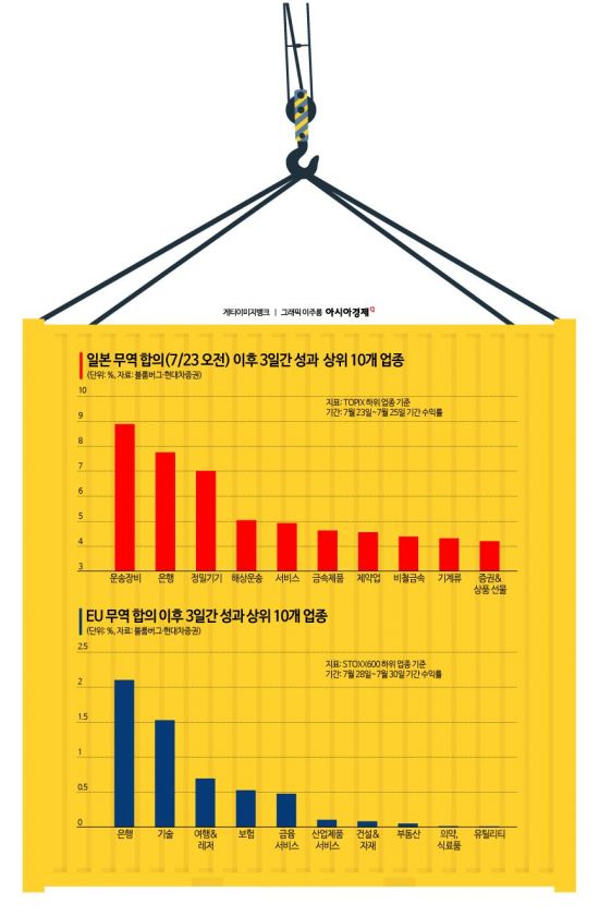 반면 50%에 이르는 고율 관세를 적용받는 철강·알루미늄이 이번 협상 테이블에서 제외되면서 넥스틸(-9.03%), 대동스틸(-8.84%), 세아제강(-8.37%) 등 철강주들이 줄줄이 급락했고, 알래스카 액화천연가스(LNG) 개발 프로젝트에 대한 언급이 빠지면서 동양철관(-14.05%), 이렘(-12.78%), 하이스틸(-12.63%) 등 강관주들도 일제히 폭락했다. 쌀과 더불어 소고기 시장의 추가 개방이 불발되자 축산물 직거래 플랫폼 업체인 미트박스는 28% 넘게 주저앉기도 했다.