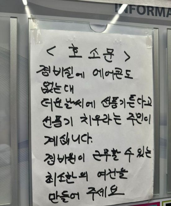 공개된 사진 속 호소문에는 "경비실엔 에어컨도 없는데 더운 날씨에 선풍기를 틀었다고 선풍기를 치우라고 항의하는 주민이 있다"며 "경비원이 최소한의 환경에서 일할 수 있도록 도와달라"는 내용이 적혀 있었다.