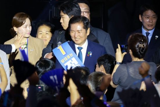 정청래 더불어민주당 당대표 후보가 2일 경기 고양시 킨텍스에서 열린 전국당원대회에서 입장하고 있다.