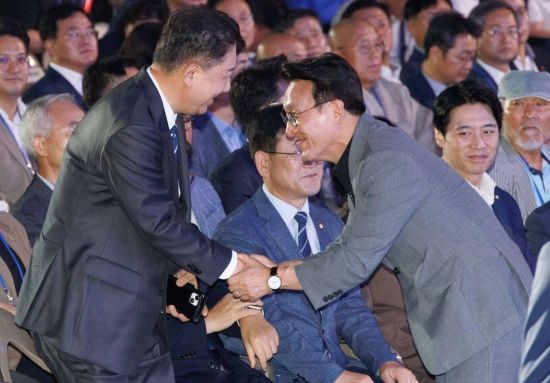 김병기 더불어민주당 대표 직무대행 겸 원내대표, 김민석 국무총리가 2일 오후 경기 고양시 킨텍스에서 열린 제2차 임시전국당원대회에서 악수를 하고 있다.