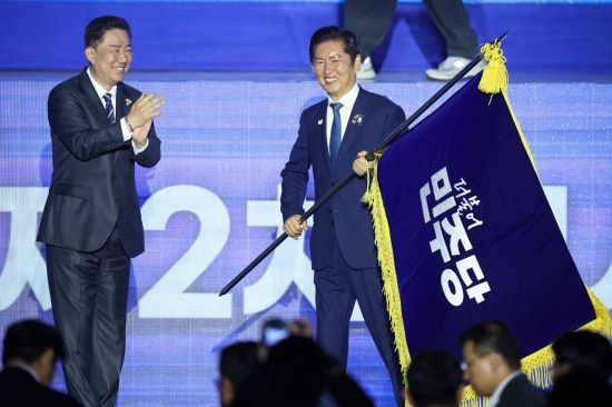 정청래 더불어민주당 신임 당대표가 2일 경기 고양시 킨텍스에서 열린 제2차 임시전국당원대회에서 김병기 원내대표로부터 당기를 이양받고 있다.