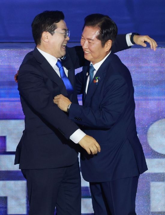 정청래 더불어민주당 신임 당대표가 2일 경기 고양시 킨텍스에서 열린 전국당원대회에서 당대표로 선출된 뒤 박찬대 후보와 포옹하고 있다.