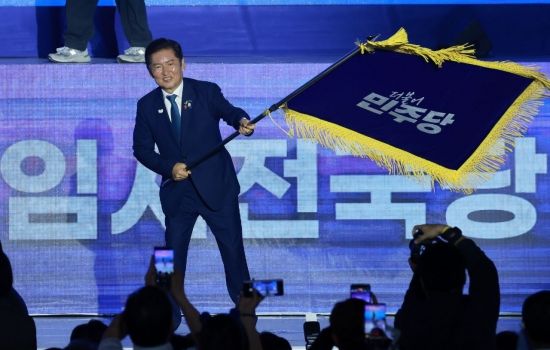정청래 더불어민주당 신임 당대표가 2일 경기 고양시 킨텍스에서 열린 전국당원대회에서 김병기 당대표 직무대행 겸 원내대표로부터 받은 당기를 흔들고 있다. 2025.8.2 김현민 기자