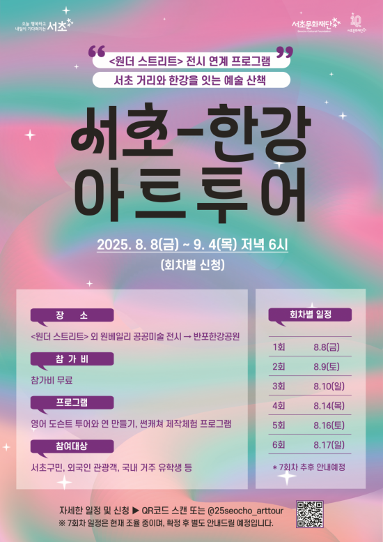 서울 서초구(구청장 전성수)와 서초문화재단(대표 강은경)이 이달 8일부터 9월 4일까지 고터·세빛 관광특구 일대에서 공공미술 전시와 예술 체험이 결합된 투어 프로그램 ‘서초-한강 아트투어’를 운영한다.