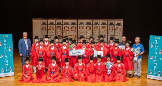 2일 서울남산국악당 크라운해태홀에서 열린 '제13회 모여라 한음(국악)영재들 경연대회'에서 윤영달 크라운해태 회장(좌측 첫번째)이 종합대상(교육부장관상)을 수상한 ‘우리 소리 비추는 아이들’과 함께 기쁨을 나누고 있다. [사진=크라운해태제과 제공]