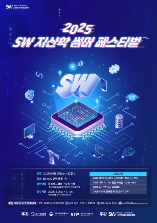 동아대학교(총장 이해우)는 소프트웨어혁신센터가 부산시와 함께 오는 20일부터 22일까지 사흘간 부산 벡스코(BEXCO) 컨벤션홀에서 '2025 SW 지산학 썸머 페스티벌'을 개최한다고 4일 전했다.