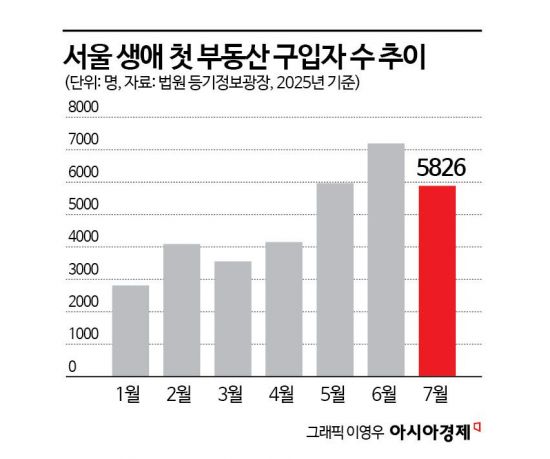 5일 법원 등기정보광장에 따르면 지난달 서울 지역 집합건물(오피스텔·아파트·연립주택·다세대주택 등)을 사들인 생애 첫 부동산 매수자 수는 5826명으로 나타났다. 이는 전월(7192명)과 비교하면 19% 감소한 것으로 지난 5월보다도 2.3% 적은 수치다.
