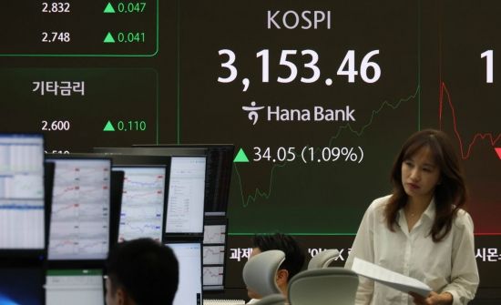 신고점 직전서 급락한 코스피가 장중 1% 가까이 상승한 4일 서울 중구 하나은행 딜링룸 모니터에 코스피를 비롯해 원/환율 등이 표시돼 있다. 이날 코스피는 전 거래일보다 5.14p(0.16%) 내린 3,114.27로 개장했지만 장중 1% 이상 상승하고 있다. 2025.8.4 조용준 기자