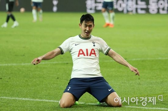 2022년 7월13일 서울 마포구 서울월드컵경기장에서 열린 쿠팡플레이 시리즈 1차전 ‘팀 K리그와 잉글랜드 프리미어리그 토트넘 홋스퍼의 친선경기’에서 토트넘 손흥민이 골을 넣은 뒤 세레머니를 하고 있다. 아시아경제DB