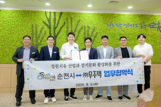 전남 순천시(시장 노관규)는 5일 시청 회의실에서 ㈜우주텍(대표 허민수)과 생태치유 산업 및 걷기문화 활성화를 위한 업무협약을 체결했다.