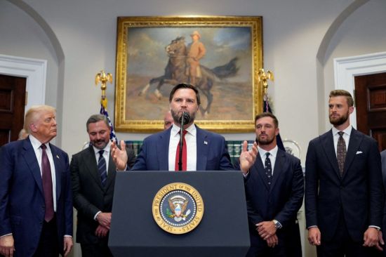 JD 밴스 미국 부통령이 지난달 31일(현지시간) 백악관 루즈벨트룸에서 연설을 하고 있다. 도널드 트럼프 미국 대통령은 5일 정치적 후계자로 밴스 부통령을 지목했다. 로이터연합뉴스