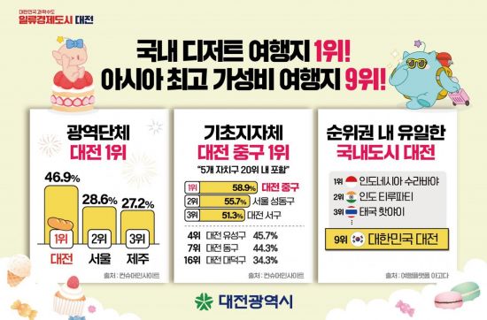 여행 리서치 전문 기관인 컨슈머인사이트가 실시한 '2025 여행자·현지인의 국내 여행지 평가 및 추천조사'에 따르면, 대전시는 디저트류 추천 광역시 부문에서 46.9%의 추천율로 1위를 차지했다.