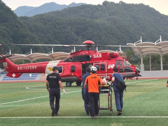 소방대원들이 경기도 가평군 북면 이곡리 635 도로에서 지난 5일 오후 4시 53분쯤 SUV 차량과 승용차가 정면 충돌해 SUV 차량 탑승자가 헬기로 이송하고 있다. 경기도북부소방재난본부 제공