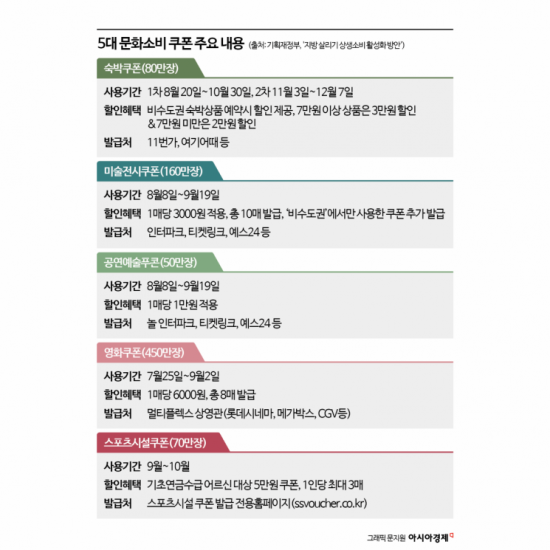 기재부는 지난달부터 발급한 영화 할인쿠폰(450만장)을 포함해 총 810만장의 소비쿠폰을 지급하기로 했다. 8월부터 ▲숙박쿠폰 80만장 ▲미술 전시쿠폰 160만장 ▲공연예술 쿠폰 50만장 ▲스포츠시설쿠폰 70만장을 지급한다. 이달 20일부터 지급되는 숙박 할인쿠폰은 비수도권 숙박상품 예약 시에만 사용할 수 있다. 7만원 이상 상품은 3만원, 7만원 미만은 2만원 할인 혜택이 적용된다. 특별재난지역은 할인 폭이 각각 5만원, 3만원으로 확대된다.
