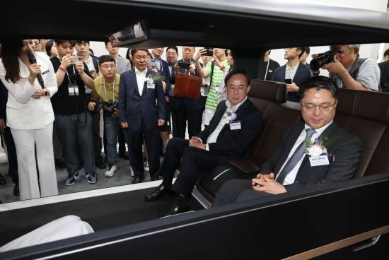 문신학 산업통상자원부 차관과 정철동 LG디스플레이 사장이 7일 서울 삼성동 코엑스에서 열린 'K-디스플레이 2025' 에서 엘지 부스를 찾아 자율주행차량용 디스플레이를 체험하고 있다.