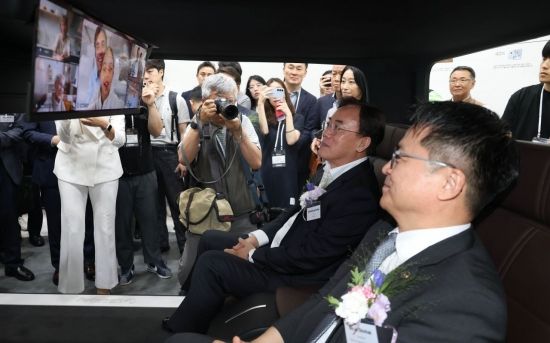 문신학 산업통상자원부 차관과 정철동 LG디스플레이 사장이 7일 서울 삼성동 코엑스에서 열린 'K-디스플레이 2025' 에서 엘지 부스를 찾아 자율주행차량용 디스플레이를 체험하고 있다.
