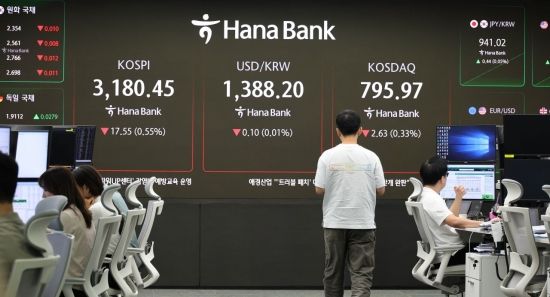 6일 서울 중구 하나은행 딜링룸에서 딜러들이 업무를 보고 있다. 이날 코스피는 전 거래일보다 15.94p(0.50%) 내린 3182.06로 코스닥은 0.27% 내린 796.48로 원-달러 환율은 1.0원 내린 1,387.3원 장을 시작했다. 2025.8.6 조용준 기자