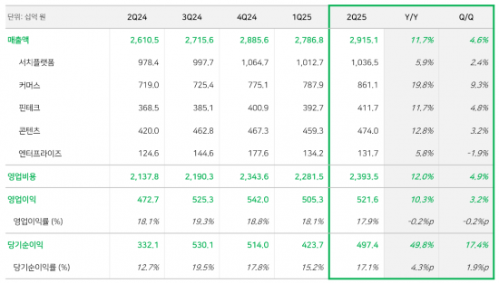 2분기 매출을 사업 부문별로 살펴보면 ▲서치플랫폼 1조365억원 ▲커머스 8611억원 ▲핀테크 4117억원 ▲콘텐츠 4740억원 ▲엔터프라이즈 1317억원 등이다.