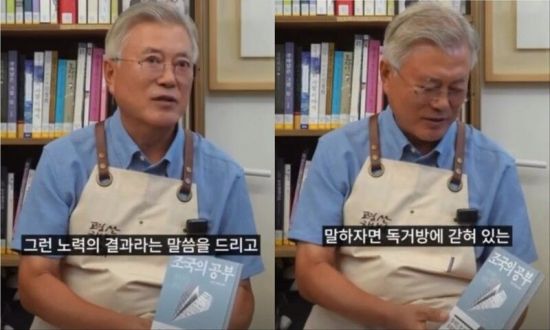 9일 조 전 대표의 사회관계망서비스(SNS)에 올라온 영상을 보면 문 전 대통령은 조 전 대표의 신간 '조국의 공부'를 독자들에게 추천했다. 지난달 30일 출간된 '조국의 공부'는 조 전 대표와 작가 겸 문학평론가 정여울 간 대담, 조 전 대표가 수감생활 중 쓴 글 등을 묶은 것이다. 부제도 '감옥에서 쓴 편지'다.