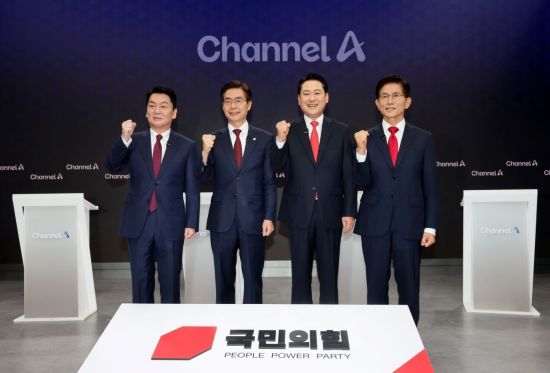 김문수 전 고용노동부 장관, 장동혁·조경태·안철수 의원은 10일 오후 서울 종로구 채널A 스튜디오에서 열린 국민의힘 당대표 후보 방송토론회에 참석했다.