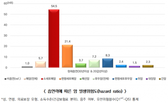 암 발생위험도 분석 결과, 일반적인 특성이나 생활환경, 유전위험점수(PRS)가 동일 수준이더라도 소세포폐암, 편평세포폐암, 편평세포후두암의 흡연으로 인한 발생위험도는 다른 암종에 비해 높았다. 30년 이상, 20갑년 이상 현재흡연자의 암 발생위험도는 비흡연자에 비해 소세포폐암이 54.5배, 편평세포폐암 21.4배, 편평세포후두암 8.3배 높은 반면, 위암은 2.4배, 간암 2.3배, 대장암 1.5배로 확인됐다.