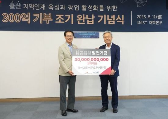 이 명예회장은 2021년 발전기금 300억원을 약정했다. 기부액은 UNIST 설립 이래 최대 규모다. 2023년 27억원 상당의 주식을 우선 기탁한 데 이어, 올해 273억원에 달하는 주식을 쾌척하며 조기 완납했다.